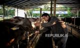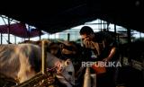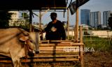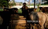 Pedagang mengecek hewan kurban di tenda penjualan hewan kurban di kawasan Kuningan, Jakarta, Selasa (21/6/2022). Menurut pedagang, jumlah persediaan hewan kurban tahun ini mengalami penurunan diakibatkan jumlah pasokan yang menurun akibat wabah penyakit mulut dan kuku (PMK) hingga 70 persen atau sebanyak 30 ekor sapi dari tahun sebelumnya mampu menyediakan sebanyak 100 ekor sapi. Republika/Thoudy Badai (FOTO : Republika/Thoudy Badai)