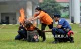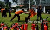 Peserta dari Satuan Tugas (Satgas) Penanggulangan Bencana dan Bahaya Kebakaran Kejaksaan Agung RI berusaha memadamkan api menggunakan Alat Pemadam Api Ringan (APAR) saat latihan gabungan bersama petugas pemadam kebakaran di Lapangan Kejaksaan Agung RI, Jakarta, Rabu (22/6/2022). Latihan tersebut merupakan kegiatan rutin tahunan yang sudah digelar ke dua kalinya pasca peristiwa kebakaran di Kejaksaan Agung 2020 lalu sebagai upaya melatih petugas dalam menghadapi kejadian kebakaran di lingkungan Kejagung. (FOTO : Republika/Thoudy Badai)