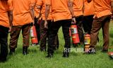 Peserta dari Satuan Tugas (Satgas) Penanggulangan Bencana dan Bahaya Kebakaran Kejaksaan Agung RI membawa apar bersiap melakukan simulasi pemadaman api saat latihan gabungan bersama petugas pemadam kebakaran di Lapangan Kejaksaan Agung RI, Jakarta, Rabu (22/6/2022). Latihan tersebut merupakan kegiatan rutin tahunan yang sudah digelar ke dua kalinya pasca peristiwa kebakaran di Kejaksaan Agung 2020 lalu sebagai upaya melatih petugas dalam menghadapi kejadian kebakaran di lingkungan Kejagung. (FOTO : Republika/Thoudy Badai)