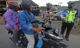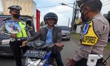 REPUBLIKA.CO.ID, SERANG -- Personel Satlantas Polres Kota Serang memberi himbauan serta menunjukkan famplet tertib berkendara kepada pengemudi sepeda motor saat Sosialisasi Tertib Berlalu Lintas di Jalan Lingkar Luar Serang, Banten, Rabu (22/6/2022).