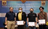 Direktur Standardisai Perangkat Pos dan Informatika Ditjen SDPPI Kemkominfo Mulyadii (kiri) berfoto bersama para pembicara (dari 2ki-ka), Ketua Umum ASIOTI Teguh Prasetya, VP (Interim) eFeeder, eFishery Andri Yadi dan Founder Nocola IoT Solution Ganang Ardiy Tama, usai Seminar Forecast Agriculture, Farm, and Fisheries Business with IoT di Surabaya, Rabu (22/6/2022). (FOTO : Dok ASIOTI)