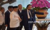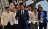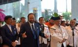 Ketua Umum Partai Nasdem Surya Paloh bersama Presiden Partai Keadilan Sejahtera (PKS) Ahmad Syaikhu berjalan untuk memberikan keterangan pers usai menggelar pertemuan di DPP Partai Nasdem, Jakarta, Rab (22/6/2022).Pertemuan antara Partai Nasdem dan PKS tersebut menghasilkan tiga kesepahaman salah satunya yaitu menjadikan Pemilu serentak 2024 sebagai instrumen demokrasi yang penuh semangat toleransi dan persatuan bangsa.Prayogi/Republika (FOTO : Prayogi/Republika.)