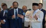 Ketua Umum Partai Nasdem Surya Paloh bersama Presiden Partai Keadilan Sejahtera (PKS) Ahmad Syaikhu memberikan keterangan pers usai menggelar pertemuan di DPP Partai Nasdem, Jakarta, Rabu (22/6/2022).Pertemuan antara Partai Nasdem dan PKS tersebut menghasilkan tiga kesepahaman salah satunya yaitu menjadikan Pemilu serentak 2024 sebagai instrumen demokrasi yang penuh semangat toleransi dan persatuan bangsa.Prayogi/Republika (FOTO : Prayogi/Republika.)
