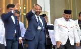 Presiden Partai Keadilan Sejahtera (PKS) Ahmad Syaikhu bersama Ketua Umum Partai Nasdem Surya Paloh memberikan keterangan pers usai menggelar pertemuan di DPP Partai Nasdem, Jakarta, Rabu (22/6/2022).Pertemuan antara Partai Nasdem dan PKS tersebut menghasilkan tiga kesepahaman salah satunya yaitu menjadikan Pemilu serentak 2024 sebagai instrumen demokrasi yang penuh semangat toleransi dan persatuan bangsa.Prayogi/Republika (FOTO : Prayogi/Republika.)