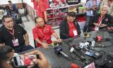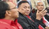 Bendahara Umum Partai Demokrasi Indonesia Perjuangan (PDIP) yang juga Gubernur Sulawesi Utara Olly Dondokambey (tengah) disaksikan Kader PDIP yang juga Gubernur Jawa Tengah Ganjar Pranowo (kanan) menjawab pertanyaan jurnalis di sela istirahat pada Rapat Kerja Nasional (Rakernas) II PDIP di Sekolah Partai PDIP, Lenteng Agung, Jakarta, Rabu (22/6/2022). Pada hari kedua rakernas tersebut membahas hal-hal strategis dalam menghadapi pemilihan umum (Pemilu) 2024, khususnya terkait dengan strategi pemenangan pemilu.  (FOTO : ANTARA/M Risyal Hidayat)