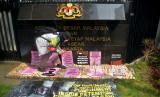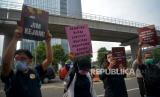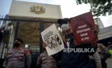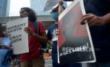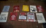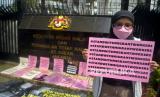 REPUBLIKA.CO.ID, Seorang yang tergabung dalam koalisi buruh migran berdaulat meletakan poster ketika aksi di depan kantor Kedutaan Besar Malaysia, Jakarta, Jumat (24/6/2022). Dalam aksinya mereka memprotes pihak Malaysia terkait penyiksaan dan kematian Buruh Migran dalam Pusat Tahanan Imigrasi di Sabah, Malaysia.