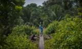 Anak melintasi jalur kereta api Pandeglang-Labuan di Cirende, Pandeglang, Banten, Jumat (24/6/2022). Kementerian Perhubungan berencana akan melakukan reaktivasi kembali jalur kereta api segmen 2 Pandeglang-Labuan sepanjang 37,9 kilometer pada tahun ini. (FOTO : ANTARA/Muhammad Bagus Khoirunas)