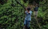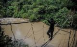Warga menyeberangi sungai menggunakan jembatan kawat besi di Desa Salamnunggal, Kecamatan Cibeber, Kabupaten Cianjur, Jawa Barat, Sabtu (25/6/2022). Untuk menghemat jarak tempuh antar desa, warga terpaksa masih menggunakan jembatan tersebut serta berharap agar pemerintah terkait mampu membangun jembatan yang layak bagi warga sekitar. (FOTO : ANTARA/Raisan Al Farisi)