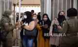 Petugas Satpol PP memeriksa warga yang akan menonton acara puncak perayaan HUT ke-495 DKI Jakarta di Jakarta International Stadium, Jakarta, Sabtu (25/6/2022). Malam puncak Jakarta Hajatan dimeriahkan oleh acara konser yang menampilkan sejumlah musisi seperti grup band Padi, Ungu dan Wali serta penyanyi solo Reza Artamevia, Mahalini, Lea Simanjuntak, Saykoji dan Kojek. Republika/Putra M. Akbar (FOTO : Republika/Putra M. Akbar)