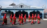 Sejumlah prajurit Keraton Kasunanan Surakarta Hadiningrat dari Lembaga Dewan Adat melakukan atraksi kirab di kawasan keraton setempat, Solo, Jawa Tengah, Ahad (26/6/2022). Lembaga Dewan Adat keraton setempat rutin menggelar atraksi prajurit setiap Hari Minggu sebagai promosi wisata dan menambah daya tarik bagi wisatawan yang mengunjungi Kota Solo. (FOTO : ANTARA/Maulana Surya)