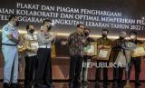 Redaktur Pelaksana Republika Subroto Kardjo (keempat kanan) bersama pimpinan media massa saat menghadiri acara Penghargaan Penyelenggaraan Angkutan Lebaran Tahun 2022 di Jakarta, Senin (27/6/2022). Kementerian Perhubungan memberikan penghargaan kepada mitra kerja Kementerian/Lembaga Pemerintahan, Perusahaan BUMN, operator transportasi dan media massa yang dinilai membantu kelancaran mudik Lebaran sesuai perannya masing-masing. Republika/Putra M. Akbar (FOTO : Republika/Putra M. Akbar)