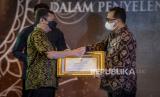 Menteri Perhubungan Budi Karya Sumadi (kanan) memberikan penghargaan kepada Redaktur Pelaksana Republika Subroto Kardjo pada acara Penghargaan Penyelenggaraan Angkutan Lebaran Tahun 2022 di Jakarta, Senin (27/6/2022). Kementerian Perhubungan memberikan penghargaan kepada mitra kerja Kementerian/Lembaga Pemerintahan, Perusahaan BUMN, operator transportasi dan media massa yang dinilai membantu kelancaran mudik Lebaran sesuai perannya masing-masing. Republika/Putra M. Akbar (FOTO : Republika/Putra M. Akbar)