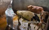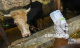 Dokter dari Dinas Ketahanan Pangan dan Peternakan Provinsi Sumatera Utara bersiap menyuntikkan vaksin kepada hewan ternak sapi saat Vaksinasi PMK Hewan Ternak di Desa Jati Kesuma, Namorambe, Deli Serdang, Sumatera Utara, Senin (27/6/2022). Pemerintah Provinsi Sumatera Utara mendapatkan bantuan 1.600 dosis vaksin Penyakit Mulut dan Kuku (PMK) dari Pemerintah Pusat yang akan digunakan untuk mengendalikan penyebaran PMK di tujuh kabupaten yang ada di Sumatera Utara hingga tiga hari ke depan. (FOTO : ANTARA/Fransisco Carolio)