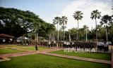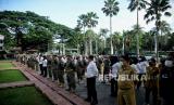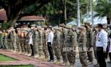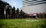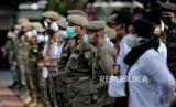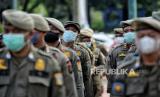 Petugas Satpol PP bersama Dinas Pariwisata dan Ekonomi Kreatif, serta TNI melakukan apel persiapan penyegelan bar-resto Holywings di Balai Kota DKI Jakarta, Jakarta Pusat, Selasa (28/6/2022). Pemprov DKI Jakarta melalui Satuan Polisi Pamong Praja (Satpol PP) melakukan penutupan secara serentak terhadap 12 outlet perusahaan bar dan resto Holywings di Jakarta hari ini. Penutupan tersebut dilakukan setelah ditemukannya sejumlah pelanggaran diantaranya pelanggaran izin usaha atau belum memiliki sertifikat standar KBLI 56301 jenis usaha bar yang telah terverifikasi. Republika/Thoudy Badai (FOTO : Republika/Thoudy Badai)