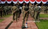 REPUBLIKA.CO.ID,JAKARTA -- Petugas Satpol PP bersama Dinas Pariwisata dan Ekonomi Kreatif, serta TNI melakukan apel persiapan penyegelan bar-resto Holywings di Balai Kota DKI Jakarta, Jakarta Pusat, Selasa (28/6/2022).