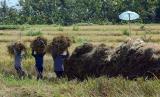 REPUBLIKA.CO.JEMBRANA -- ID, Petani membawa padi saat panen raya di Desa Manistutu, Jembrana, Bali, Selasa (28/6/2022). Harga jual gabah di Kabupaten tersebut mengalami penurunan dari Rp5.000 per kg menjadi Rp4.300 per kg akibat padi yang dipanen banyak yang rusak menyusul sering terjadinya hujan disertai angin kencang di kawasan itu.