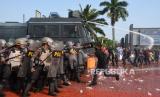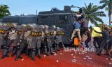 REPUBLIKA.CO.ID, SERANG -- Polisi berupaya menghalau para "pengunjuk rasa" anarkis saat simulasi Pengamanan Demonstrasi Anarkis Pasca Pemilu di halaman Mapolda Banten, di Serang, Selasa (28/6/2022). Simulasi yang melibatkan 450 personel pengamanan pemilu itu bertujuan melatih kesigapan personel dalam mengatasi unjuk rasa anarkis.