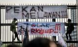 REPUBLIKA.CO.ID, JAKARTA -- Sejumlah mahasiswa memasang spanduk saat berunjuk rasa terkait Rancangan Kitab Undang-Undang Hukum Pidana (RKUHP) di depan gedung DPR, Jakarta, Selasa (28/6/2022). Dalam aksinya mereka menuntut DPR dan pemerintah untuk membuka draft Rancangan Kitab Undang-Undang Hukum Pidana (RKUHP) ke publik dan hapus pasal-pasal yang bermasalah.