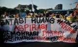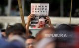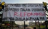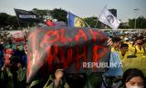 REPUBLIKA.CO.ID, Sejumlah mahasiswa memasang spanduk saat berunjuk rasa terkait Rancangan Kitab Undang-Undang Hukum Pidana (RKUHP) di depan gedung DPR, Jakarta, Selasa (28/6/2022). Dalam aksinya mereka menuntut DPR dan pemerintah untuk membuka draft Rancangan Kitab Undang-Undang Hukum Pidana (RKUHP) ke publik dan hapus pasal-pasal yang bermasalah.