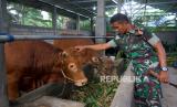 Seorang peternak yang juga merupakan prajurit TNI, Serda Kadek Yadnyano memberi makan sapi di Limboto, Kabupaten Gorontalo, Gorontalo, Selasa (28/6/2022). Peternak di daerah itu mulai menyiapkan sapi yang dijual untuk kurban pada Hari Raya Idul Adha dengan harga berkisar Rp13 juta hingga Rp30 juta rupiah tergantung jenis dan bobot sapi. (FOTO : ANTARA/Adiwinata Solihin)