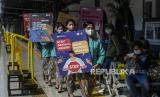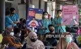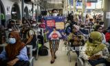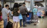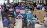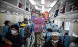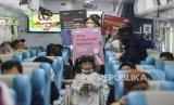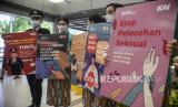 Petugas melakukan kampanye pencegahan pelecehan seksual di Stasiun Pasar Senen, Jakarta, Rabu (29/6/2022). PT KAI Daop 1 bersama Komnas Perempuan mengkampanyekan antisipasi pelecehan seksual untuk mengajak masyarakat agar berani mencegah dan melaporkan jika melihat tindakan atau mengalami pelecehan seksual di kereta. (FOTO : Republika/Putra M. Akbar)