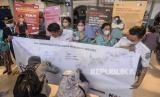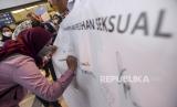 Warga membubuhkan tanda tangan saat kampanye pencegahan pelecehan seksual di Stasiun Pasar Senen, Jakarta, Rabu (29/6/2022). PT KAI Daop 1 bersama Komnas Perempuan mengkampanyekan antisipasi pelecehan seksual untuk mengajak masyarakat agar berani mencegah dan melaporkan jika melihat tindakan atau mengalami pelecehan seksual di kereta. Republika/Putra M. Akbar (FOTO : Republika/Putra M. Akbar)