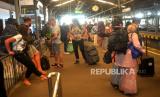Penumpang berjalan ke peron kereta api di Stasiun Besar Yogyakarta, Rabu (28/6/2022). PT KAI Daerah Operasi 6 Yogyakarta menambah empat perjalanan kereta api untuk memenuhi kebutuhan pelanggan selama masa libur sekolah 2022. (FOTO : Wihdan Hidayat / Republika)