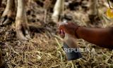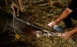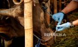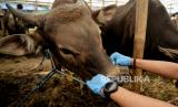 Tenaga kesehatan mengecek kondisi fisik hewan qurban di tempat penjualan hewan qurban di Jalan Dr. Sumarno, Pulo Gadung, Jakarta Timur, Jumat (1/7/2022). Pemprov DKI Jakarta resmi melepaskan sebanyak 865 petugas pemeriksa kesehatan hewan dan daging qurban di seluruh DKI Jakarta sebagai upaya menjaga dan memastikan hewan qurban dalam keadaan sehat saat menunaikan ibadah Idul Adha 1443 hijriah. Republika/Thoudy Badai (FOTO : Republika/Thoudy Badai)