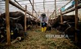 Petugas menyemprotkan obat pencegah kuman kepada hewan qurban di tempat penjualan hewan qurban di Jalan Dr. Sumarno, Pulo Gadung, Jakarta Timur, Jumat (1/7/2022). Menurut pedagang, seluruh hewan kurban miliknya dilakukan pemeriksaan kesehatan secara rutin serta ditempatkan di kandang karantina sebelum dijual guna mengantisipasi penyebaran penyakit mulut kuku (PMK). Sementara, Pemprov DKI Jakarta resmi melepaskan sebanyak 865 petugas pemeriksa kesehatan hewan dan daging qurban di seluruh DKI Jakarta sebagai upaya menjaga dan memastikan hewan qurban dalam keadaan sehat saat menunaikan ibadah Idul Adha 1443 hijriah. Republika/Thoudy Badai (FOTO : Republika/Thoudy Badai)