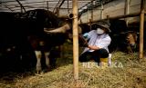 Petugas menyemprotkan obat pencegah kuman kepada hewan qurban di tempat penjualan hewan qurban di Jalan Dr. Sumarno, Pulo Gadung, Jakarta Timur, Jumat (1/7/2022). Menurut pedagang, seluruh hewan kurban miliknya dilakukan pemeriksaan kesehatan secara rutin serta ditempatkan di kandang karantina sebelum dijual guna mengantisipasi oenyebaran penyakit mulut kuku (PMK). Sementara, Pemprov DKI Jakarta resmi melepaskan sebanyak 865 petugas pemeriksa kesehatan hewan dan daging kurban di seluruh DKI Jakarta sebagai upaya menjaga dan memastikan hewan kurban dalam keadaan sehat saat menunaikan ibadah Idul Adha 1443 hijriah. Republika/Thoudy Badai (FOTO : Republika/Thoudy Badai)