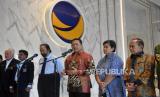 Ketua MPR Bambang Soesatyo (ketiga kanan) didampingi Wakil Ketua MPR Lestari Moerdijat (kedua kanan) dan Syarief Hasan (kanan) bersama Ketua Umum Partai Nasdem Surya Paloh (ketiga kiri) dan Sekjen Partai Nasdem Johnny G Plate (kedua kiri) memberikan keterangan pers seusai melakukan silaturahmi kebangsaan di kantor DPP Partai Nasdem, Jakarta, Jumat (1/7/22). Kunjungan silaturahmi kebangsaan itu dalam rangka menjalin hubungan kemitraan antara lembaga tertinggi negara dengan partai politik termasuk diantaranya membahas berbagai persoalan bangsa. (FOTO : ANTARA/Indrianto Eko Suwarso)