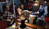 Petugas melayani pengunjung yang ingin membeli produk kain batik dalam pameran Gebyar Wisata Nusantara 2022 di Jakarta Convention Center (JCC), Jakarta, Jumat (1/7/2022). Pameran yang diikuti sejumlah pemerintah daerah, penyedia jasa pariwisata, dan indsutri pendukung tersebut berlangsung hingga 3 Juli 2022 untuk mempromosikan potensi-potensi wisata di daerah. (FOTO : ANTARA/Aditya Pradana Putra)