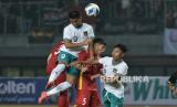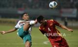 Penyerang Timnas Indonesia U19 Hokky Caraka Bintang melakukan duel udara dengan pemain Vietnam saat pertandingan Piala AFF U19 di Stadion Patriot Candrabhaga, Bekasi, Jawa Barat, Sabtu (2/7/2022). Pertandingan berakhir imbang tanpa gol. (FOTO : Republika/Edwin Putranto)