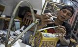 Perajin menyelesaikan pembuatan wadah buah dari kertas koran bekas di bengkel kerja (workshop) di kawasan Cibabat, Cimahi Utara, Kota Cimahi, Ahad (3/7/2022). Berbagai jenis kerajinan daur ulang berbahan dasar kertas koran bekas berupa tas, dompet, wadah buah, hiasan dinding dan aneka miniatur yang dijual dengan harga Rp90 ribu hingga Rp1 juta tersebut telah menembus pasar ekspor di Singapura, Hongkong dan Australia. (FOTO : REPUBLIKA/ABDAN SYAKURA)
