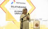 Rektor Unpad Rina Indiastuti memberikan sambutan pada acara silaturahmi dan halal bi halal IKA Unpad di Graha Aula Sanusi Hardjadinata Kampus Unpad, Jalan Dipati Ukur, Kota Bandung, Ahad (3/7/2022). (FOTO : REPUBLIKA/ABDAN SYAKURA)
