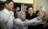 Menteri BUMN Erick Thohir (kanan) berfoto dengan salah satu alumni usai menghadiri silaturahmi dan halal bi halal IKA Unpad di Graha Aula Sanusi Hardjadinata Kampus Unpad, Jalan Dipati Ukur, Kota Bandung, Ahad (3/7/2022). (FOTO : REPUBLIKA/ABDAN SYAKURA)