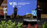 REPUBLIKA.CO.ID, BANDUNG Menteri BUMN Erick Thohir bersama Menteri Koperasi dan UKM Teten Masduki menghadiri acara silaturahmi dan halal bi halal IKA Unpad di Graha Aula Sanusi Hardjadinata Kampus Unpad, Jalan Dipati Ukur, Kota Bandung, Ahad (3/7/2022).