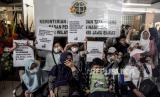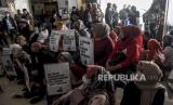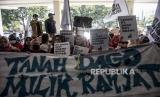Warga Dago Elos dan Cirapuhan yang tergabung dalam Dago Melawan berunjuk rasa di dalam Kantor ATR/BPN Kanwil Jabar, Jalan Soekarno Hatta, Buahbatu, Kota Bandung, Senin (4/7/2022). Dalam unjuk rasa tersebut mereka menuntut kejelasan sikap ATR/BPN terkait status tempat tinggal mereka yang kini diklaim oleh ahli waris berdasarkan putusan Peninjauan Kembali (PK) Mahkamah Agung, mendesak ATR/BPN Kota Bandung memberikan sertifikat warga yang berdomisili sesuai dengan UU Pokok Agraria dan memeriksa kembali eigendom verponding (bukti kepemilikan era Hindia Belanda) di wilayah Dago Elos hingga Cirapuhan. Foto: Republika/Abdan Syakura (FOTO : REPUBLIKA/ABDAN SYAKURA)
