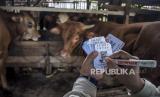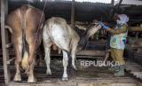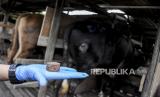 Dokter hewan dari Dinas Ketahanan Pangan dan Pertanian (DKPP) Kota Bandung didampingi peternak memeriksa kesehatan hewan ternak sapi yang telah sembuh dari penyakit mulut dan kuku (PMK) di Sukahaji, Kecamatan Babakan Ciparay, Kota Bandung, Senin (4/7/2022). Pemerintah melalui Badan Nasional Penanggulangan Bencana (BNBP) menetapkan Status Keadaan Tertentu darurat Penyakit Mulut dan Kuku (PMK) hingga akhir 2022. Data pada 1 Juli 2022, pukul 12.00 WIB, terdapat 233.370 kasus aktif yang tersebar di 246 wilaya, dan 22 provinsi. (FOTO : REPUBLIKA/ABDAN SYAKURA)