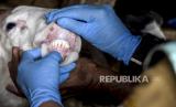 Dokter hewan dari Dinas Ketahanan Pangan dan Pertanian (DKPP) Kota Bandung didampingi peternak memeriksa gigi hewan ternak domba di Sukahaji, Kecamatan Babakan Ciparay, Kota Bandung, Senin (4/7/2022). Pemerintah melalui Badan Nasional Penanggulangan Bencana (BNBP) menetapkan Status Keadaan Tertentu darurat Penyakit Mulut dan Kuku (PMK) hingga akhir 2022. Data pada 1 Juli 2022, pukul 12.00 WIB, terdapat 233.370 kasus aktif yang tersebar di 246 wilaya, dan 22 provinsi. (FOTO : REPUBLIKA/ABDAN SYAKURA)