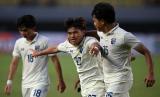 Pesepak bola Tim Nasional Thailand U-19 Nattakit Butsing (tengah) dan rekan-rekannya berselebrasi usai membobol gawang Tim Nasional Myanmar U-19 dalam laga penyisihan Grup A Piala AFF U-19 2022 di Stadion Patriot Candrabhaga, Bekasi, Jawa Barat, Senin (4/7/2022). Thailand memenangi laga tersebut dengan skor 3-0. (FOTO : ANTARA/Aditya Pradana Putra)