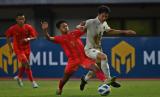 Pesepak bola Tim Nasional Thailand U-19 Thawatchai Inprakhon (kiri) memenangi perebutan bola dengan pesepak bola Tim Nasional Myanmar U-19 Ar Kar Kyaw (kanan) dalam laga penyisihan Grup A Piala AFF U-19 2022 di Stadion Patriot Candrabhaga, Bekasi, Jawa Barat, Senin (4/7/2022). Thailand memenangi laga tersebut dengan skor 3-0. (FOTO : ANTARA/Aditya Pradana Putra)