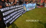 Peserta dari Forum Silaturahmi Ormas Jogja menggelar aksi di halaman Polda DIY, Yogyakarta, Selasa (5/7/2022). Dalam aksinya mereka menolak aksi anarkisme di Yogyakarta. Serta mendukung pengusutan pelaku bentrok antarkelompok di Seturan pada Senin (4/7/2022) lalu. (FOTO : Wihdan Hidayat / Republika)