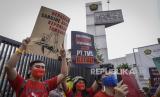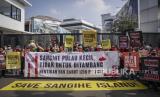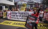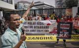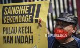 REPUBLIKA.CO.ID, JAKARTA -- Warga yang tergabung dalam barisan Koalisi Save Sangihe Island (SSI) berunjuk rasa di depan kantor Direktorat Jenderal Mineral dan Batubara, Jakarta, Kamis (7/7/2022). Dalam aksi tersebut mereka menuntut kegiatan PT. Tambang Mas Sangihe (TMS) yang izin lingkungannya telah dicabut oleh Pengadilan Tata Usaha Negara (PTUN) Manado segera dihentikan.