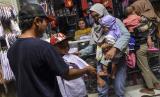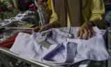 Pedagang melayani calon pembeli saat berbelanja seragam sekolah untuk anaknya di Pasar Manis, Kabupaten Ciamis, Jawa Barat, Kamis (7/7/2022). Menjelang tahun ajaran baru para orang tua berbelanja kelengkapan sekolah seperti buku, baju seragam, dan sepatu. (FOTO : ANTARA/Adeng Bustomi)