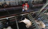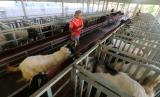 Pekerja menggiring kambing untuk ditawarkan secara daring di tempat usaha penggemukan kambing Kelurahan Ngronggo, Kota Kediri, Jawa Timur, Jumat (8/7/2022). Menjelang Idul Adha, pemilik usaha penggemukan kambing di tempat tersebut memanfaatkan media sosial sebagai sarana promosi hewan kurban yang efektif dan aman seiring berkurangnya penjualan karena pembatasan lalu lintas hewan ternak antar daerah guna menangkal penyebaran penyakit mulut dan kuku (PMK).  (FOTO : ANTARA/Prasetia Fauzani)