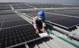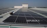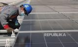Teknisi Pembangkit Listrik Tenaga Surya (PLTS) memasang label di pabrik PT Sanghiang Perkasa (KALBE Nutritionals) Cikampek, Jawa Barat, Jumat (8/7/2022). PT Bank Negara Indonesia (Persero) Tbk. mendukung program pemerintah dalam percepatan penetrasi energi terbarukan yakni dengan berkomitmen untuk terus mendorong penyaluran kredit pada sektor energi baru dan terbarukan yang sejauh ini telah mencapai Rp10,3 triliun. Tata Aidilla/Republika (FOTO : Tahta Aidilla/Republika)