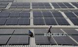 Teknisi Pembangkit Listrik Tenaga Surya (PLTS) melakukan perawatan rutin di pabrik PT Sanghiang Perkasa (KALBE Nutritionals) Cikampek, Jawa Barat, Jumat (8/7/2022). PT Bank Negara Indonesia (Persero) Tbk. mendukung program pemerintah dalam percepatan penetrasi energi terbarukan yakni dengan berkomitmen untuk terus mendorong penyaluran kredit pada sektor energi baru dan terbarukan yang sejauh ini telah mencapai Rp10,3 triliun. (FOTO : Tahta Aidilla/Republika)