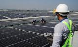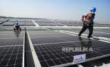 Teknisi Pembangkit Listrik Tenaga Surya (PLTS) melakukan perawatan rutin di pabrik PT Sanghiang Perkasa (KALBE Nutritionals) Cikampek, Jawa Barat, Jumat (8/7/2022). PT Bank Negara Indonesia (Persero) Tbk. mendukung program pemerintah dalam percepatan penetrasi energi terbarukan yakni dengan berkomitmen untuk terus mendorong penyaluran kredit pada sektor energi baru dan terbarukan yang sejauh ini telah mencapai Rp10,3 triliun. Tata Aidilla/Republika (FOTO : Tahta Aidilla/Republika)