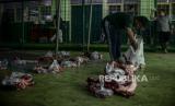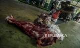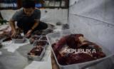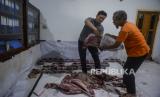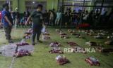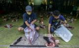 Panitia menyiapkan daging kurban untuk dibagikan kepada warga di Masjid Jami Al Huda Muhammadiyah, Tebet, Jakarta, Sabtu (9/7/2022). Sebanyak 17 sapi dan 18 kambing yang dikurbankan di masjid tersebut diaslurkan kepada 1.750 mustahik yang berada di wilayah Kecamatan Tebet. Republika/Putra M. Akbar (FOTO : Republika/Putra M. Akbar)